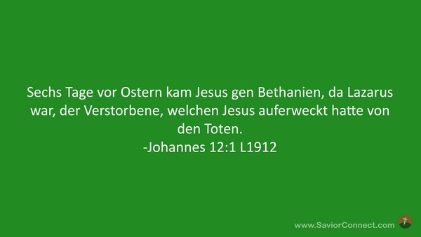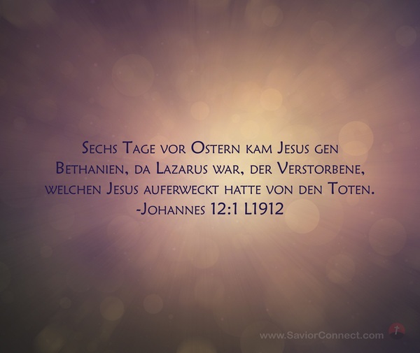 Sechs Tage vor Ostern kam Jesus gen Bethanien, da Lazarus war, der Verstorbene, welchen Jesus auferweckt hatte von den Toten. -Johannes 12:1 L1912