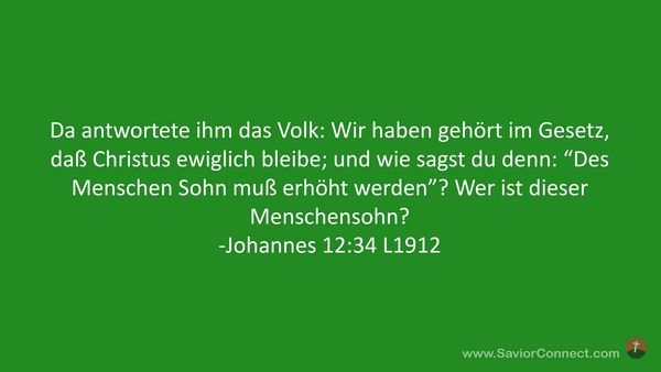 Da antwortete ihm das Volk: Wir haben gehört im Gesetz, daß Christus ewiglich bleibe; und wie sagst du denn: “Des Menschen Sohn muß erhöht werden”? Wer ist dieser Menschensohn? -Johannes 12:34 L1912