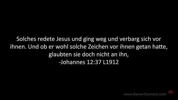 Solches redete Jesus und ging weg und verbarg sich vor ihnen. Und ob er wohl solche Zeichen vor ihnen getan hatte, glaubten sie doch nicht an ihn, -Johannes 12:37 L1912