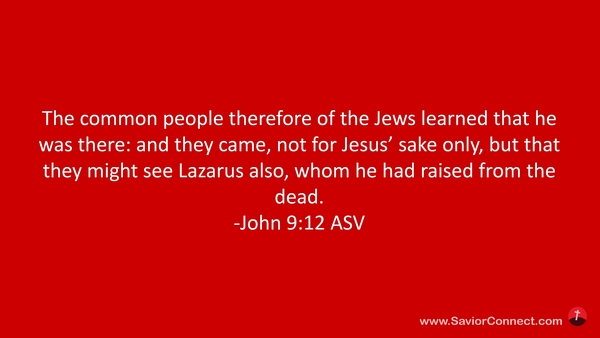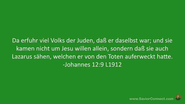 Da erfuhr viel Volks der Juden, daß er daselbst war; und sie kamen nicht um Jesu willen allein, sondern daß sie auch Lazarus sähen, welchen er von den Toten auferweckt hatte. -Johannes 12:9 L1912