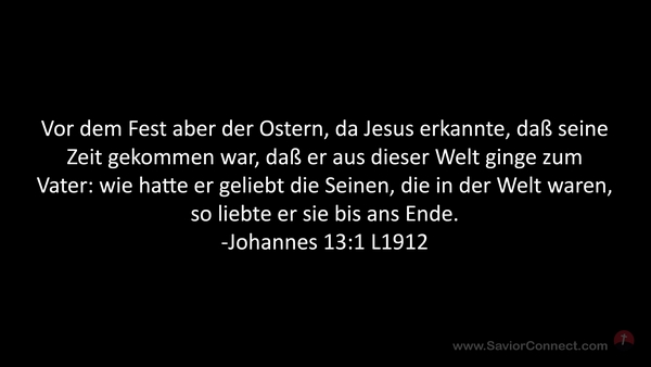 Vor dem Fest aber der Ostern, da Jesus erkannte, daß seine Zeit gekommen war, daß er aus dieser Welt ginge zum Vater: wie hatte er geliebt die Seinen, die in der Welt waren, so liebte er sie bis ans Ende. -Johannes 13:1 L1912