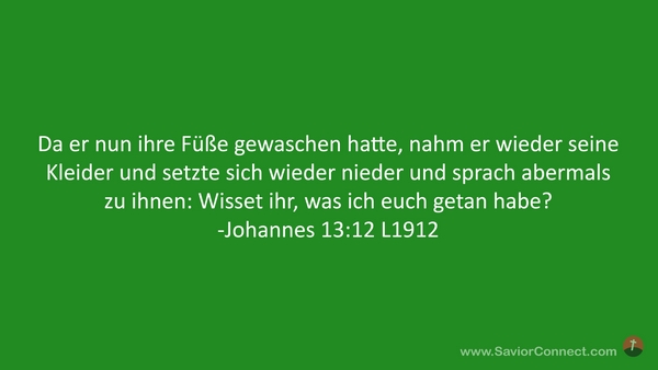 Da er nun ihre Füße gewaschen hatte, nahm er wieder seine Kleider und setzte sich wieder nieder und sprach abermals zu ihnen: Wisset ihr, was ich euch getan habe? -Johannes 13:12 L1912