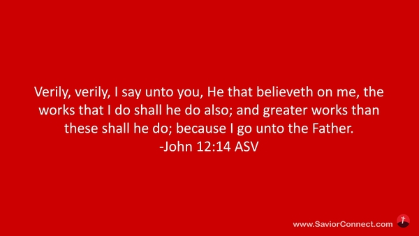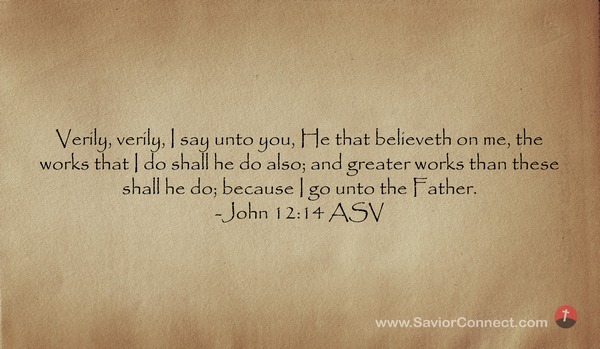 Wahrlich, wahrlich ich sage euch: Wer an mich glaubt, der wird die Werke auch tun, die ich tue, und wird größere als diese tun; denn ich gehe zum Vater. -Johannes 14:12 L1912