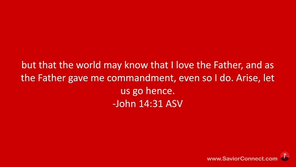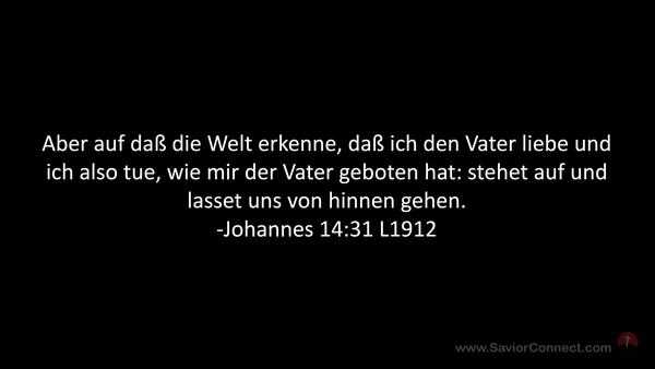 Aber auf daß die Welt erkenne, daß ich den Vater liebe und ich also tue, wie mir der Vater geboten hat: stehet auf und lasset uns von hinnen gehen. -Johannes 14:31 L1912