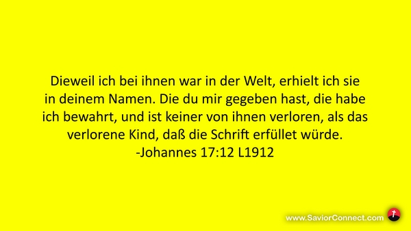 Dieweil ich bei ihnen war in der Welt, erhielt ich sie in deinem Namen. Die du mir gegeben hast, die habe ich bewahrt, und ist keiner von ihnen verloren, als das verlorene Kind, daß die Schrift erfüllet würde. -Johannes 17:12 L1912