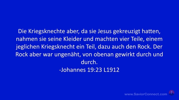 Die Kriegsknechte aber, da sie Jesus gekreuzigt hatten, nahmen sie seine Kleider und machten vier Teile, einem jeglichen Kriegsknecht ein Teil, dazu auch den Rock. Der Rock aber war ungenäht, von obenan gewirkt durch und durch. -Johannes 19:23 L1912