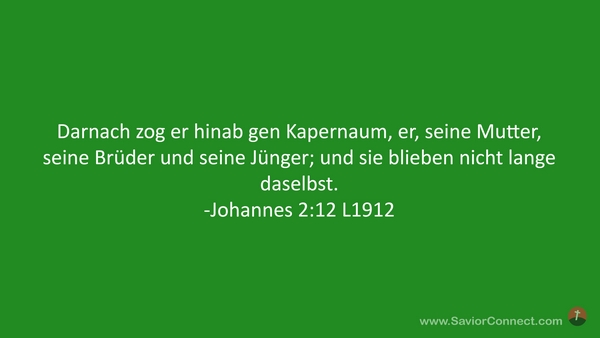 Darnach zog er hinab gen Kapernaum, er, seine Mutter, seine Brüder und seine Jünger; und sie blieben nicht lange daselbst. -Johannes 2:12 L1912