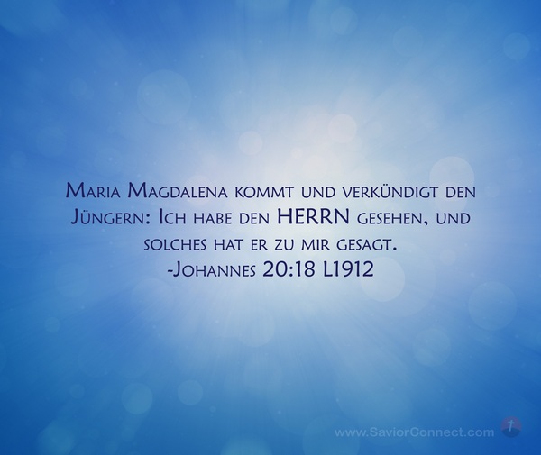 Maria Magdalena kommt und verkündigt den Jüngern: Ich habe den HERRN gesehen, und solches hat er zu mir gesagt. -Johannes 20:18 L1912