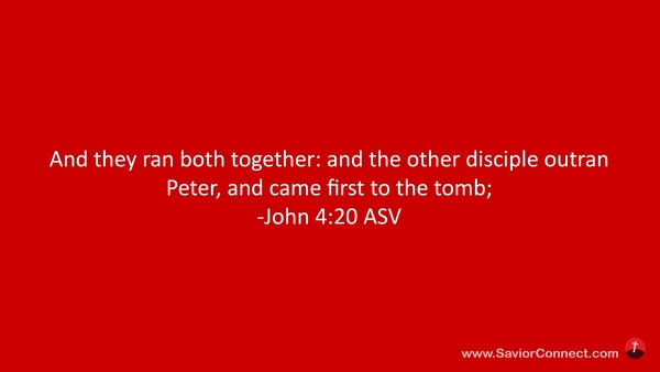 Es liefen aber die zwei miteinander, und der andere Jünger lief zuvor, schneller denn Petrus, und kam am ersten zum Grabe, -Johannes 20:4 L1912