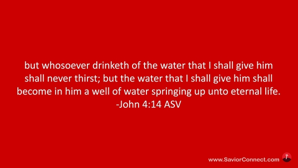 wer aber von dem Wasser trinken wird, das ich ihm gebe, den wird ewiglich nicht dürsten; sondern das Wasser, das ich ihm geben werde, das wird in ihm ein Brunnen des Wassers werden, das in das ewige Leben quillt. -Johannes 4:14 L1912