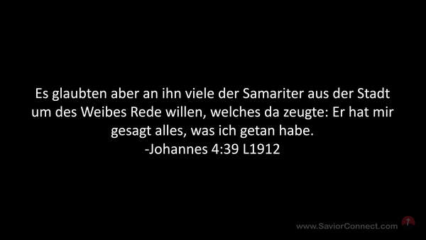 Es glaubten aber an ihn viele der Samariter aus der Stadt um des Weibes Rede willen, welches da zeugte: Er hat mir gesagt alles, was ich getan habe. -Johannes 4:39 L1912