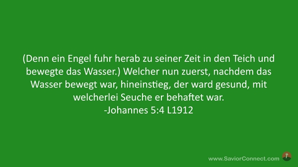 (Denn ein Engel fuhr herab zu seiner Zeit in den Teich und bewegte das Wasser.) Welcher nun zuerst, nachdem das Wasser bewegt war, hineinstieg, der ward gesund, mit welcherlei Seuche er behaftet war. -Johannes 5:4 L1912