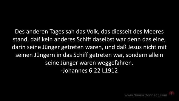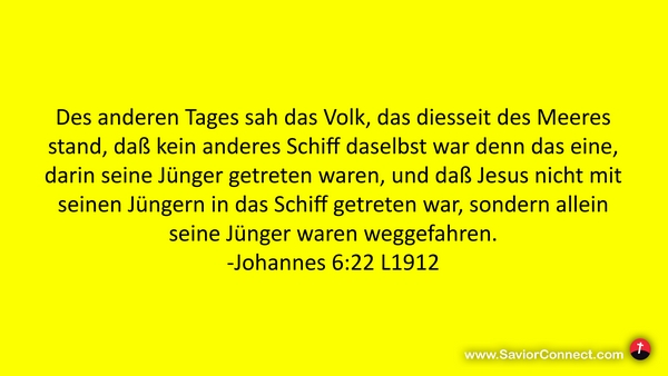 Des anderen Tages sah das Volk, das diesseit des Meeres stand, daß kein anderes Schiff daselbst war denn das eine, darin seine Jünger getreten waren, und daß Jesus nicht mit seinen Jüngern in das Schiff getreten war, sondern allein seine Jünger waren weggefahren. -Johannes 6:22 L1912