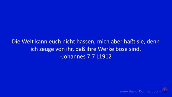 Die Welt kann euch nicht hassen; mich aber haßt sie, denn ich zeuge von ihr, daß ihre Werke böse sind. -Johannes 7:7 L1912