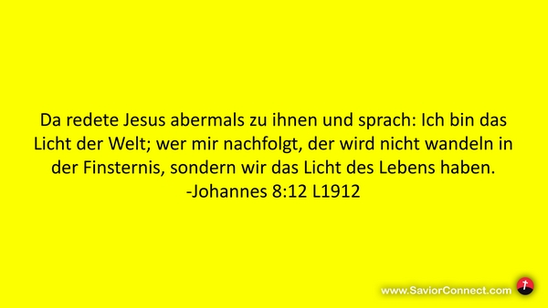 Da redete Jesus abermals zu ihnen und sprach: Ich bin das Licht der Welt; wer mir nachfolgt, der wird nicht wandeln in der Finsternis, sondern wir das Licht des Lebens haben. -Johannes 8:12 L1912