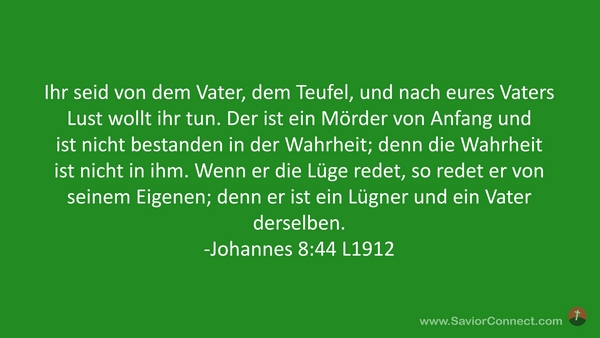 Ihr seid von dem Vater, dem Teufel, und nach eures Vaters Lust wollt ihr tun. Der ist ein Mörder von Anfang und ist nicht bestanden in der Wahrheit; denn die Wahrheit ist nicht in ihm. Wenn er die Lüge redet, so redet er von seinem Eigenen; denn er ist ein Lügner und ein Vater derselben. -Johannes 8:44 L1912