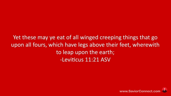 Doch das sollt ihr essen von allem, was sich regt und Flügel hat und geht auf vier Füßen: was noch zwei Beine hat, womit es auf Erden hüpft; -Levitikus 11:21 L1912