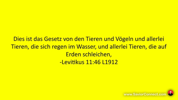 Dies ist das Gesetz von den Tieren und Vögeln und allerlei Tieren, die sich regen im Wasser, und allerlei Tieren, die auf Erden schleichen, -Levitikus 11:46 L1912