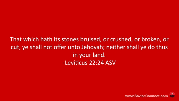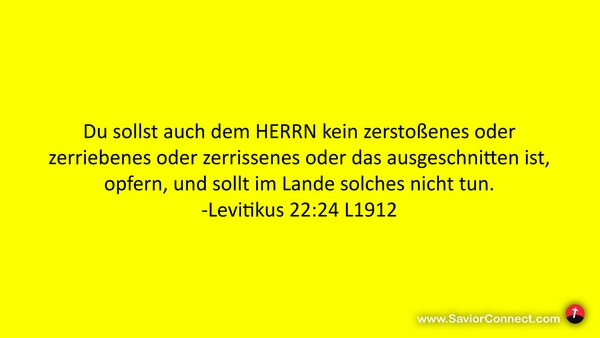 Du sollst auch dem HERRN kein zerstoßenes oder zerriebenes oder zerrissenes oder das ausgeschnitten ist, opfern, und sollt im Lande solches nicht tun. -Levitikus 22:24 L1912