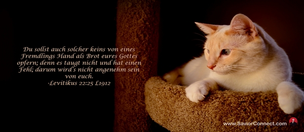 Du sollst auch solcher keins von eines Fremdlings Hand als Brot eures Gottes opfern; denn es taugt nicht und hat einen Fehl; darum wird's nicht angenehm sein von euch. -Levitikus 22:25 L1912