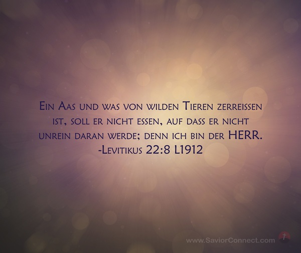 Ein Aas und was von wilden Tieren zerreißen ist, soll er nicht essen, auf daß er nicht unrein daran werde; denn ich bin der HERR. -Levitikus 22:8 L1912
