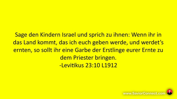 Sage den Kindern Israel und sprich zu ihnen: Wenn ihr in das Land kommt, das ich euch geben werde, und werdet's ernten, so sollt ihr eine Garbe der Erstlinge eurer Ernte zu dem Priester bringen. -Levitikus 23:10 L1912