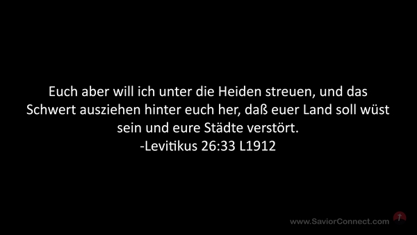 Euch aber will ich unter die Heiden streuen, und das Schwert ausziehen hinter euch her, daß euer Land soll wüst sein und eure Städte verstört. -Levitikus 26:33 L1912