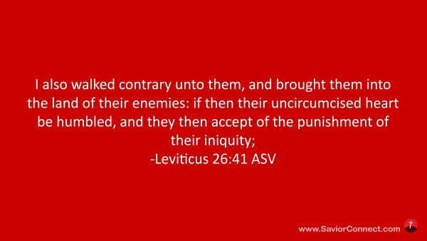 Darum will ich auch ihnen entgegen wandeln und will sie in ihrer Feinde Land wegtreiben; da wird sich ja ihr unbeschnittenes Herz demütigen, und dann werden sie sich die Strafe ihrer Missetat gefallen lassen. -Levitikus 26:41 L1912