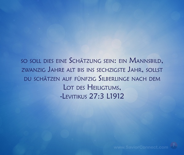 so soll dies eine Schätzung sein: ein Mannsbild, zwanzig Jahre alt bis ins sechzigste Jahr, sollst du schätzen auf fünfzig Silberlinge nach dem Lot des Heiligtums, -Levitikus 27:3 L1912