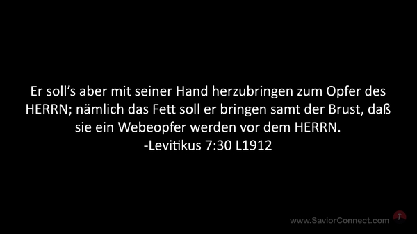 Er soll's aber mit seiner Hand herzubringen zum Opfer des HERRN; nämlich das Fett soll er bringen samt der Brust, daß sie ein Webeopfer werden vor dem HERRN. -Levitikus 7:30 L1912