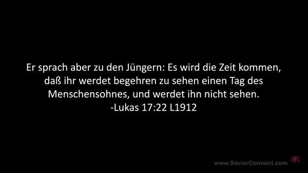 Er sprach aber zu den Jüngern: Es wird die Zeit kommen, daß ihr werdet begehren zu sehen einen Tag des Menschensohnes, und werdet ihn nicht sehen. -Lukas 17:22 L1912