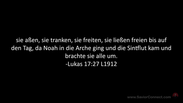 sie aßen, sie tranken, sie freiten, sie ließen freien bis auf den Tag, da Noah in die Arche ging und die Sintflut kam und brachte sie alle um. -Lukas 17:27 L1912