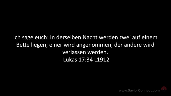Ich sage euch: In derselben Nacht werden zwei auf einem Bette liegen; einer wird angenommen, der andere wird verlassen werden. -Lukas 17:34 L1912