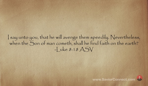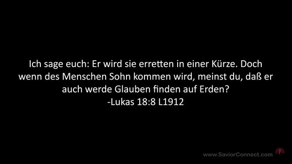 Ich sage euch: Er wird sie erretten in einer Kürze. Doch wenn des Menschen Sohn kommen wird, meinst du, daß er auch werde Glauben finden auf Erden? -Lukas 18:8 L1912