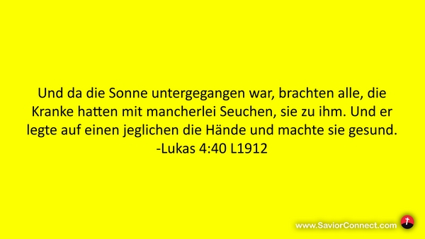 Und da die Sonne untergegangen war, brachten alle, die Kranke hatten mit mancherlei Seuchen, sie zu ihm. Und er legte auf einen jeglichen die Hände und machte sie gesund. -Lukas 4:40 L1912