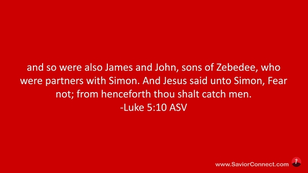 desgleichen auch Jakobus und Johannes, die Söhne des Zebedäus, Simons Gesellen. Und Jesus sprach zu Simon: Fürchte dich nicht; denn von nun an wirst du Menschen fangen. -Lukas 5:10 L1912