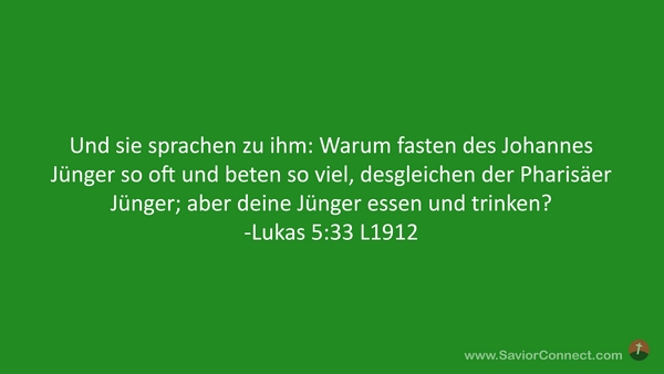 Und sie sprachen zu ihm: Warum fasten des Johannes Jünger so oft und beten so viel, desgleichen der Pharisäer Jünger; aber deine Jünger essen und trinken? -Lukas 5:33 L1912
