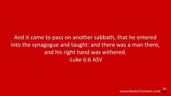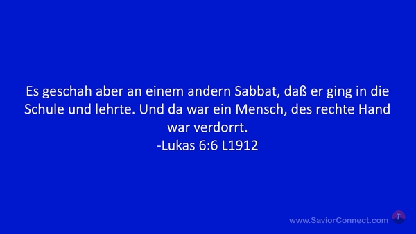Es geschah aber an einem andern Sabbat, daß er ging in die Schule und lehrte. Und da war ein Mensch, des rechte Hand war verdorrt. -Lukas 6:6 L1912