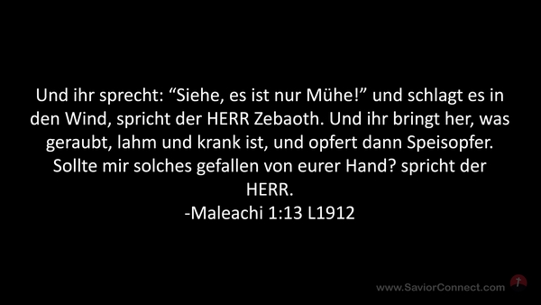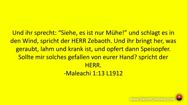 Und ihr sprecht: “Siehe, es ist nur Mühe!” und schlagt es in den Wind, spricht der HERR Zebaoth. Und ihr bringt her, was geraubt, lahm und krank ist, und opfert dann Speisopfer. Sollte mir solches gefallen von eurer Hand? spricht der HERR. -Maleachi 1:13 L1912