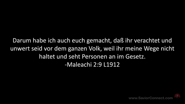 Darum habe ich auch euch gemacht, daß ihr verachtet und unwert seid vor dem ganzen Volk, weil ihr meine Wege nicht haltet und seht Personen an im Gesetz. -Maleachi 2:9 L1912