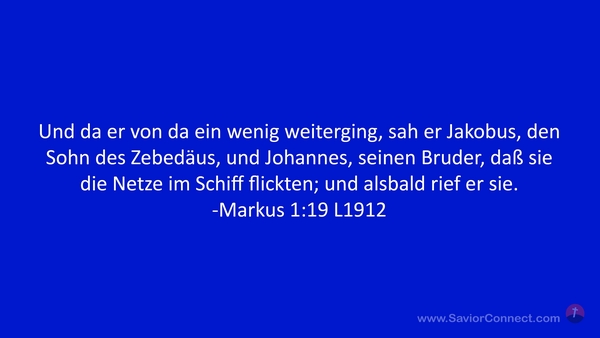 Und da er von da ein wenig weiterging, sah er Jakobus, den Sohn des Zebedäus, und Johannes, seinen Bruder, daß sie die Netze im Schiff flickten; und alsbald rief er sie. -Markus 1:19 L1912