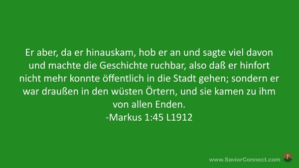 Er aber, da er hinauskam, hob er an und sagte viel davon und machte die Geschichte ruchbar, also daß er hinfort nicht mehr konnte öffentlich in die Stadt gehen; sondern er war draußen in den wüsten Örtern, und sie kamen zu ihm von allen Enden. -Markus 1:45 L1912