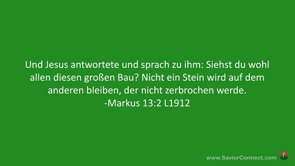 Und Jesus antwortete und sprach zu ihm: Siehst du wohl allen diesen großen Bau? Nicht ein Stein wird auf dem anderen bleiben, der nicht zerbrochen werde. -Markus 13:2 L1912