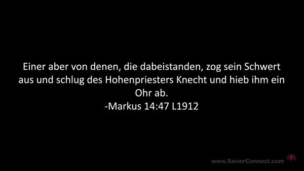 Einer aber von denen, die dabeistanden, zog sein Schwert aus und schlug des Hohenpriesters Knecht und hieb ihm ein Ohr ab. -Markus 14:47 L1912
