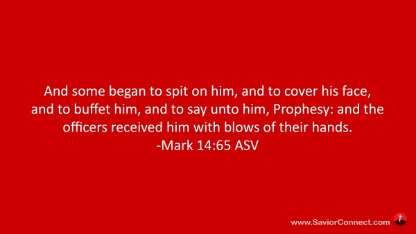 Da fingen an etliche, ihn zu verspeien und zu verdecken sein Angesicht und ihn mit Fäusten zu schlagen und zu ihm zu sagen: Weissage uns! Und die Knechte schlugen ihn ins Angesicht. -Markus 14:65 L1912
