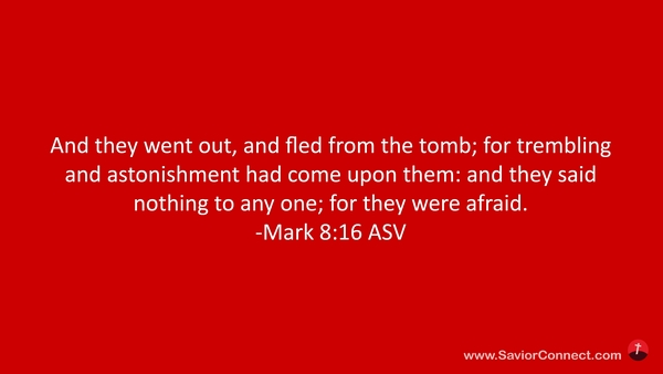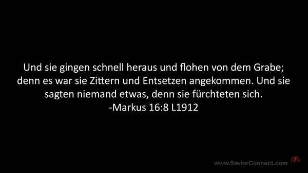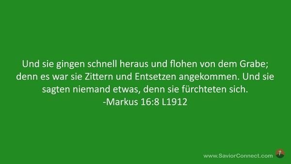 Und sie gingen schnell heraus und flohen von dem Grabe; denn es war sie Zittern und Entsetzen angekommen. Und sie sagten niemand etwas, denn sie fürchteten sich. -Markus 16:8 L1912