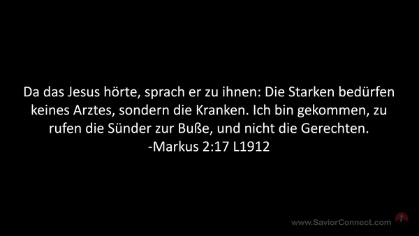 Da das Jesus hörte, sprach er zu ihnen: Die Starken bedürfen keines Arztes, sondern die Kranken. Ich bin gekommen, zu rufen die Sünder zur Buße, und nicht die Gerechten. -Markus 2:17 L1912