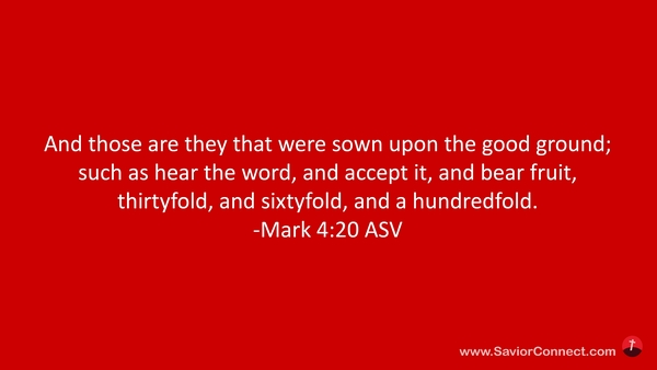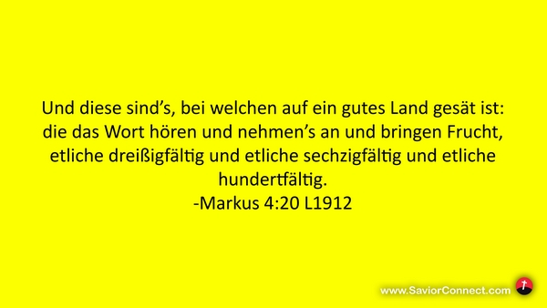 Und diese sind's, bei welchen auf ein gutes Land gesät ist: die das Wort hören und nehmen's an und bringen Frucht, etliche dreißigfältig und etliche sechzigfältig und etliche hundertfältig. -Markus 4:20 L1912