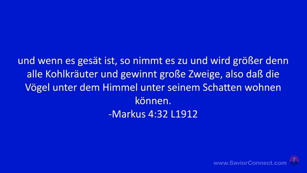 und wenn es gesät ist, so nimmt es zu und wird größer denn alle Kohlkräuter und gewinnt große Zweige, also daß die Vögel unter dem Himmel unter seinem Schatten wohnen können. -Markus 4:32 L1912