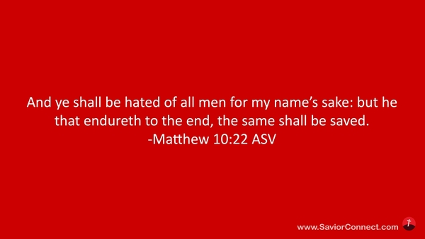 Und ihr müsset gehaßt werden von jedermann um meines Namens willen. Wer aber bis an das Ende beharrt, der wird selig. -Matthäus 10:22 L1912